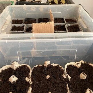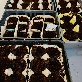 Essais à l’intérieur de la maison, car pas encore de serre. Il y en a partout, j'adore. Nous plantons dans le jardin le temps que le champ se régénère car avant c'était une terre de bovins.